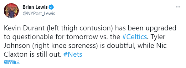 杜兰特出战状态升级!曝丁威迪季后赛复出,名记预测篮网冲冠最佳轮换