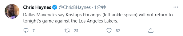第三节还剩2分30多秒,波尔津吉斯在一次进攻中不幸崴脚,脚踝呈90度崴伤,捂着脚踝十分痛苦,随后他先是回到独行侠替补席,紧接着波神一脸沮丧,一瘸一拐走回更衣室;然后独行侠官方宣布,波尔津吉斯因左脚踝扭伤直接退出比赛;