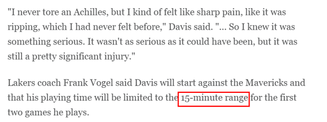 确实如此,如果伤病不严重,浓眉也不会伤停30场比赛了。湖人主帅沃格尔表示,浓眉将在对独行侠的比赛中首发出场,但他复出后的前两场比赛,比赛时间都会严格限制在15分钟以内。