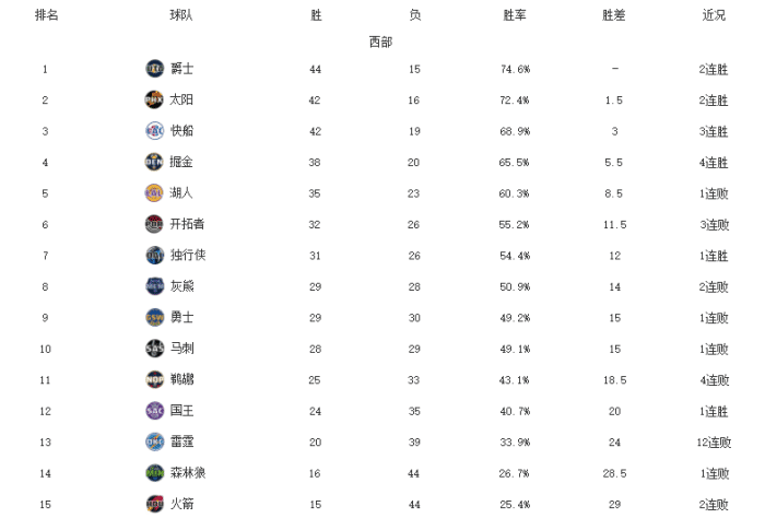 来源:24直播网04-22 16:2524直播网讯讯北京时间4月22日NBA常规赛进行了12场比赛,有13支西部球队出战,各队结果不同,战绩榜前列的爵士和太阳都赢球了,勇士惜败给奇才、雷霆、马刺和火箭都输了球,独行侠击败活塞、开拓者不敌掘金、快船大逆转击败灰熊、国王最后1分钟逆转森林狼。接下来我们一起来看看西部最新排名: