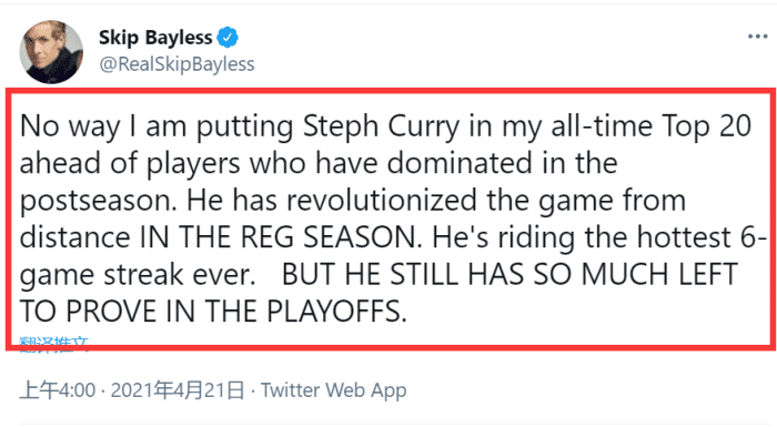 早些时候,skip发了这样一条推文:我绝不会把库里放进我的历史前20中,因为前20的球员都在季后赛有过统治级别的表现!库里的三分彻底改变了篮球这项运动,但仅限于常规赛,他打出了历史上最火热的连续6场比赛,但他在季后赛仍然有很多需要去证明。