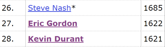 首先,生涯至今,杜兰特的三分命中数达到1621个,排在历史第28位。他只要再投进两个三分球,就能超越目前排在第27位的埃里克-戈登(1622个)。赛季至今,杜兰特已经打了20场比赛,其中16场至少命中两记三分。超过戈登后,杜兰特的下一个追赶目标就是他目前的主教练纳什。纳什生涯三分命中数达到1685个,排名历史第26位。