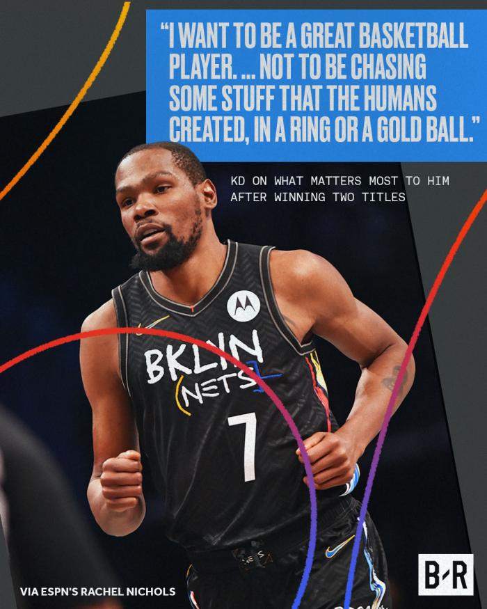 此前接受记者采访,杜兰特透露自己的生涯终极目标并不是总冠军,而是要成为一位伟大的篮球运动员,杜兰特表示:我想成为一名伟大的篮球运动员,而不是为了追逐人类创造的东西——戒指或者总冠军奖杯。