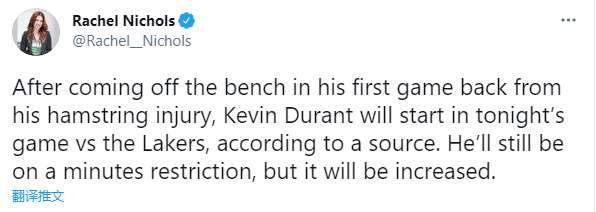 来源:24直播网04-11 16:0124直播网讯讯篮网再次变阵,据名记Rachel Nichols报道,杜兰特将在篮网对阵湖人比赛中首发出战,依旧会受到限时令,但上场时间比之前有所增加;此前杜兰特伤愈复出首战,被临时撤下首发并且替补上场;如今迎战卫冕冠军,杜兰特重返首发。