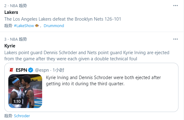 赛后湖人残阵击败篮网以及欧文和施罗德遭驱逐都冲上热搜引热议,排在推特热搜榜前三;美媒直呼湖人摧毁了篮网。