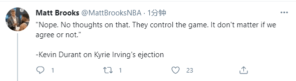 杜兰特回应驱逐欧文,他表示:对此没有任何想法。他们控制着比赛,和我们是否同意没有一点关系;施罗德本人也回应驱逐:我甚至不知道自己做了什么,但是我被驱逐出去了,为此我向队友表示歉意。