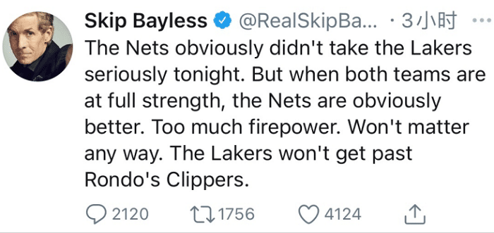 名嘴Skip Bayless在社交媒体上点评本场比赛的时候非常直接,他看衰湖人:“篮网今晚显然没有认真对待湖人,但当两队都全员健康时,篮网显然更强。很多的火力,无论怎样都没有关系。湖人将无法通过隆多的快船队。”