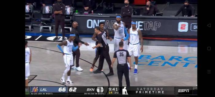 勇者相争,智者胜,在这场比赛中,湖人队主教练沃格尔的临场指挥显然要胜过篮网队的主教练,带着残阵,上半场双方打平,下半场,湖人率先发力,而当比赛进行到第三节结束还有8分多钟的时候意外发生了。