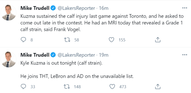 庄神和麦克勒莫能打,对于湖人来说当然是利好。但赛前也传来坏消息,沃格尔表示,库兹马在上一场对猛龙的比赛中拉伤了小腿,他将不会出战对热火的这场比赛。库兹马的检查结果已经出炉,是一级拉伤,情况并不严重,但预计也要缺席几天。