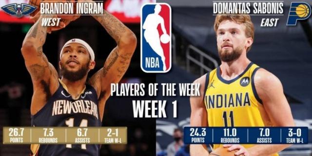 来源:24直播网12-30 20:01NBA新赛季战火重燃,经过一星期的角逐,各支球队的状态和近况大致能看出个七七八八。经过揭幕战、年终大战等重要战役的洗礼,首周的周最佳球员评选出炉,印第安纳步行者的多曼塔斯-萨博尼斯与新奥尔良鹈鹕的布兰登-英格拉姆分别当选。