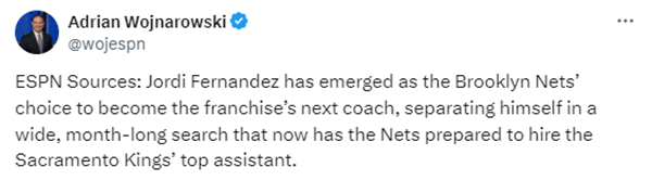 消息人士透露,篮网总经理肖恩-马克斯最近几周与数十名候选人进行了会面,41岁的费尔南德斯最终脱颖而出,他成为篮网自2019-20赛季以来的第5位主帅,费尔南德斯将在近期与篮网老板蔡崇信进行会面。