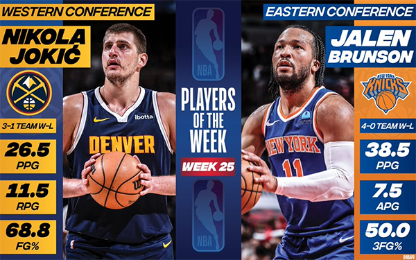 来源:24直播网04-16 12:0824直播网讯讯 北京时间4月16日,NBA官方公布了第25周,也是常规赛最后一周的周最佳球员。掘金的约基奇当选西部周最佳,这是约基奇生涯第14次当选周最佳(队史最多),也是本赛季第2次获得这一奖项。尼克斯的布伦森当选东部周最佳,这是布伦森生涯第5次当选周最佳,也是本赛季第4次获此殊荣。詹姆斯上周场均32.7分9篮板11助攻3抢断,获得周最佳的提名。