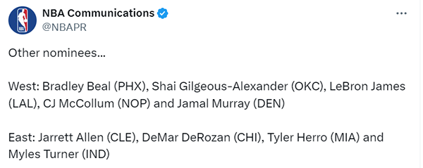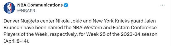 NBA官宣周最佳:约基奇、布伦森当选 詹姆斯提名场均 32+9+11