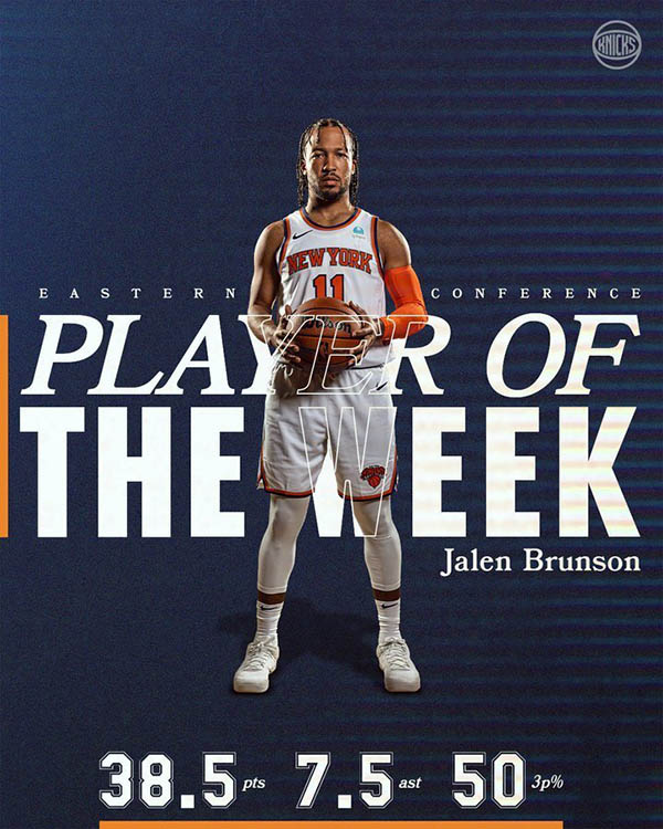 布伦森上周场均38.5分3.5篮板7.5助攻,投篮命中率51%,三分命中率50%,罚球命中率91.7%,率领尼克斯打出4胜0负的战绩。尼克斯官方晒海报祝贺布伦森获奖。