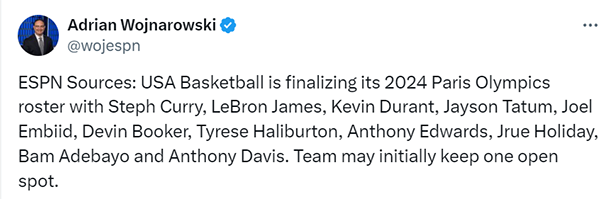 来源:24直播网04-16 11:4624直播网讯讯 北京时间4月16日,据名记Woj报道,美国男篮即将出炉2024年巴黎奥运的参赛球员名单,目前已经敲定11人,他们分别是:库里、詹姆斯、杜兰特、塔图姆、恩比德、布克、哈利伯顿、爱德华兹、霍乐迪、阿德巴约和浓眉,球队可能会暂时空缺一个名额。至于谁能赶上末班车,目前还不确定。