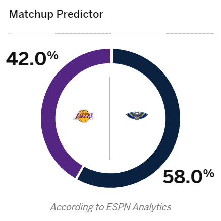 明天上午7点30分,湖人将在客场与鹈鹕打响西部第7争夺战,赢者就会直接以西部第7的身份晋级季后赛,首轮大战西部第2的掘金;ESPN预测湖人胜率为42%,鹈鹕胜率为58%;值得一提的是,本赛季4次交手,湖人对阵鹈鹕的战绩为3胜1负。