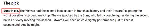 今年杜兰特打出健康的一年,出战75场是他离开勇士后出战次数最多的一个赛季;杜兰特带领太阳49胜33负压哨晋级直通季后赛,他们将在季后赛首轮大战森林狼,NBA官网预测太阳4-2淘汰森林狼。