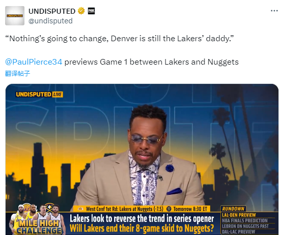 此前美国杨毅A-史密斯表示若湖人能在首轮击败掘金,他们就能夺得总冠军,詹姆斯的历史地位可能超越乔丹;不过NBA名宿保罗-皮尔斯表示:这轮季后赛马上就会开打,什么都不会改变(和上赛季相比),掘金仍然是湖人的爸爸。他们第一场比赛就会打出声明,至少赢15分。湖人对穆雷没有办法,对约基奇没有办法。