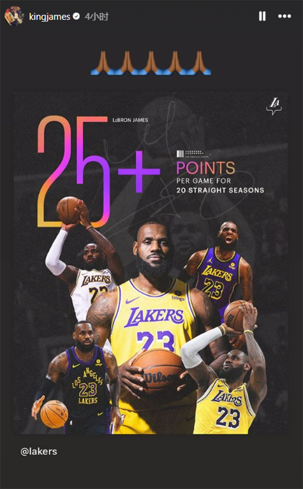 詹姆斯本赛季常规赛场均拿下25.7分,职业生涯21年连续20年场均得分25+(新秀赛季场均20.9分),詹姆斯转发自己的这一历史第一且唯一的神迹。
