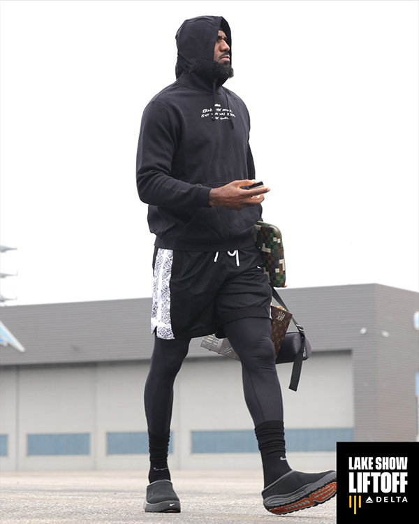 湖人全队正式登上飞往丹佛的专机,39岁老詹身穿黑色连帽卫衣和短裤亮相,提着行李和保温杯,目视远方时一脸严肃和专注的表情。