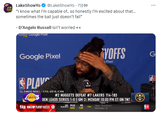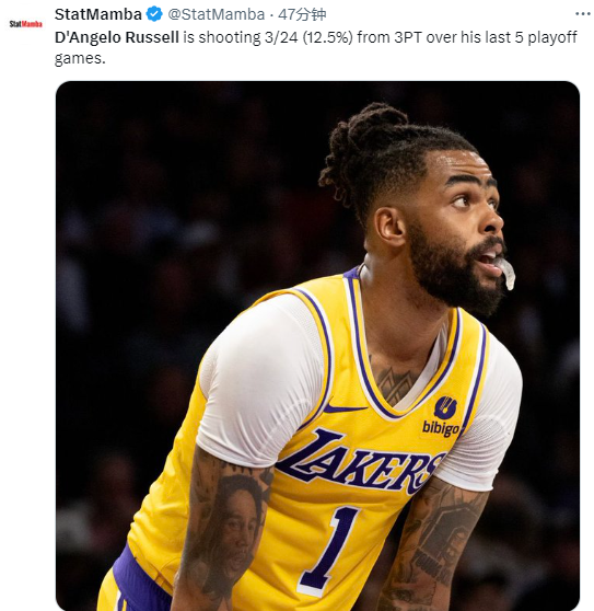去年西决,湖人0-4惨遭掘金横扫,拉塞尔在整个系列赛的表现都十分糟糕,今年首轮再战掘金,拉塞尔又拉了,上半场11投4中、三分5中0仅仅贡献8分,下半场拉塞尔继续打铁,詹姆斯和浓眉两大核心的体能明显透支,最终湖人输掉比赛,赛后老詹直接扭头离场。