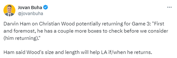 对于伍德可能G3复出,湖人主帅哈姆表示:首先,在我们考虑(他回归)之前,他还有几个方面需要检查; 哈姆还表示,如果伍德回归,他的体型和身高将会给球队带来帮助。