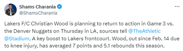 伍德计划G3复出,詹眉迎来“救星”!湖人大战卫冕冠军有戏了?