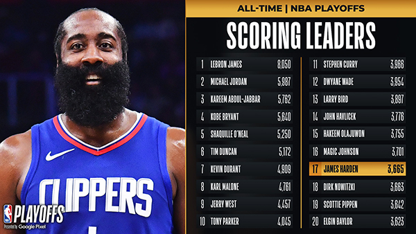 2、哈登季后赛总得分超越皮蓬和诺维斯基升到历史第17位