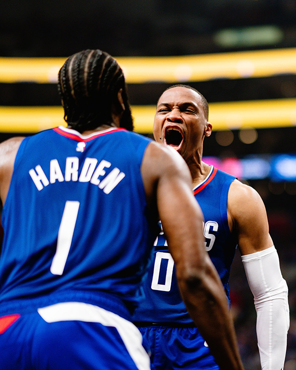 第二节,哈登休息时文乔治和威少带队拉开分差,哈登挥着毛巾冲上球场疯狂庆祝,哈登重新回来后命中三分,三分造犯规三罚全中,快船老板鲍尔默激情庆祝,哈登中投2+1怒吼庆祝再次点燃球馆,登哥连得9分后助攻威少空接暴扣,登威撞胸疯狂庆祝,快船15-1继续扩大领先,快船半场56-30领先26分。