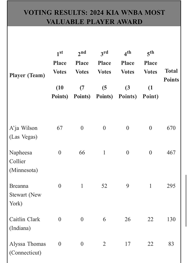 凭借出色的表现,阿贾-威尔逊获得全部67张第一选票,总共670分冠绝联盟,全票夺得WNBA本赛季年度最有价值球员大奖,这是阿贾-威尔逊个人第3座MVP奖杯,2020、2022年她都曾斩获WNBA的MVP奖项;阿贾-威尔逊也成为辛西娅-库珀戴克之后WNBA史上第二位全票MVP得主。