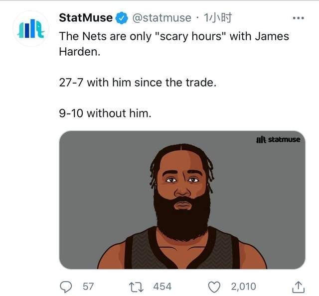 真正的大哥!哈登在场时篮网战绩27胜7负,缺阵时篮网战绩9胜10负!