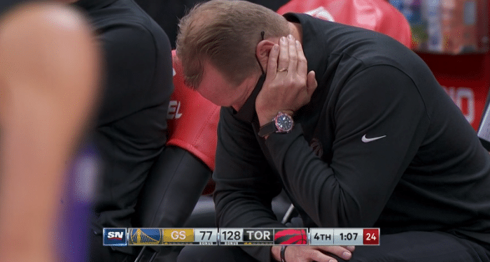 由于比赛早早失去悬念,猛龙主教练纳斯提前开启休息模式——坐在替补席,右手托腮紧闭眼睛快睡着了;反观勇士队,库里目瞪口呆直接愣住了,不过库里还是接受了这样的结局,比赛快结束时,镜头拍到库里搞怪的画面,“拳打脚踢”比划功夫,也许小学生是想用这来化解尴尬吧,或者是库里想上场打猛龙吧。