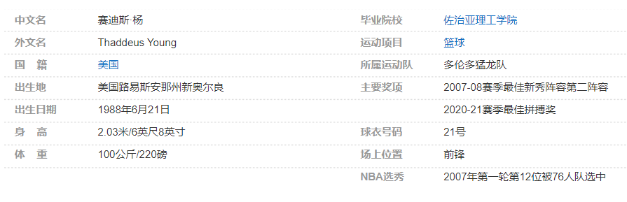 赛迪斯-杨(Thaddeus Young),1988年6月21日出生于美国路易斯安那州新奥尔良(New Orleans,LA),美国职业篮球运动员,司职前锋 [53] ,效力于NBA多伦多猛龙队。