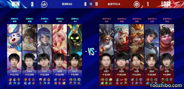 第三局,纯粹是KSG的碾压局了,晚星的赵怀真在前期就帮助对抗路建立了优势,先拿到一血的情况下又灵性用一技能断了马腿,救了啊泽一命。KSG拿到优势之后,虞姬的发育也没人能限制,13分钟就拿下了比赛。