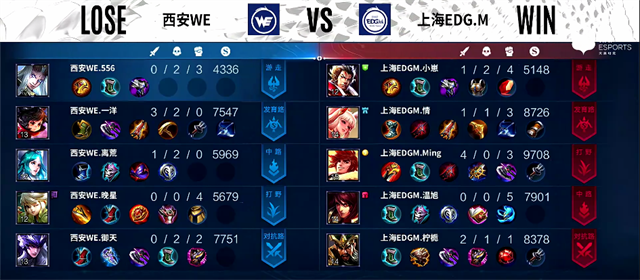 开局上海EDG.M入侵野区,橘右京拿下红Buff。2分20秒橘右京拿下暴君。4分50秒战云拿下主宰。5分10秒鲁班七号推掉下路一塔,5分20秒中路团战,6分钟橘右京拿下暴君。7分钟野区团战,双方3换3。8分33秒鲁班七号推掉下路二塔。10分10秒赵云拿下暴君,西安WE中路一塔被破,橘右京拿下主宰。11分钟上路团战,上海EDG.M打出0换3。11分40秒鲁班七号推掉中路高地塔。12分55秒高地团,双方1换1。14分钟橘右京拿下暴君。15分45秒中路团战,双方2换2。17分30秒河道团战,双方1换1。19分20秒廉颇被击杀。20分钟风暴龙王团,西安WE打出0换4。21分钟赵云拿下风暴龙王。22分40秒西安WE推掉上路高地塔。27分钟中路团战,赵云被击杀。27分55秒上海EDG.M推掉水晶率先拿下一分。
