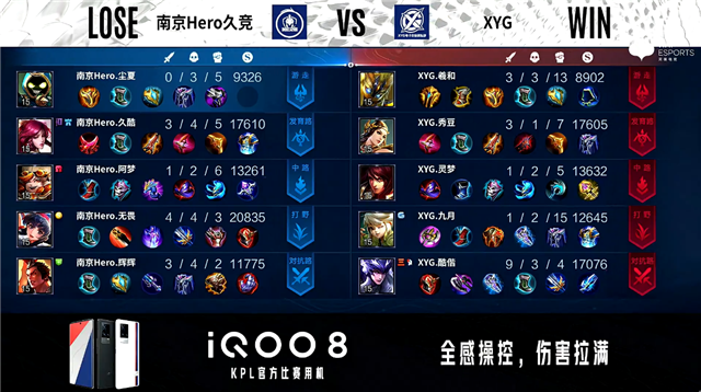 开局南京Hero中路公孙离抢线,XYG边路换线。1分43秒XYG中路击杀橘右京拿到一血。2分02秒XYG对抗路击杀蔡文姬。2分12秒南京Hero拿下暴君。3分31秒XYG拿下主宰。4分13秒南京Hero发育路击杀兰陵王。5分38秒XYG暴君处击杀蔡文姬。6分34秒南京Hero拿下暴君。7分51秒XYG中路击杀公孙离。8分03秒XYG拿下主宰。9分55秒中路团战双方1换1。11分06秒XYG中路击杀橘右京。11分40秒XYG中路击杀公孙离。11分56秒XYG拿下暗影暴君。15分11秒南京Hero主宰处击杀廉颇。15分33秒南京Hero拿下暗影主宰。15分55秒双方互换边路二塔。16分53秒南京Hero拿下暗影暴君,XYG摧毁敌方对抗路二塔。17分33秒中路团战XYG打出0换2。18分11秒XYG摧毁敌方中路外、二塔。20分11秒XYG中路击杀蔡文姬。21分09秒龙王处团战XYG击杀弈星。22分36秒龙王处团战XYG打出1换3。23分32秒XYG龙王处击杀公孙离。23分49秒野区团战XYG打出0换5。24分15秒XYG摧毁敌方水晶拿下比赛。