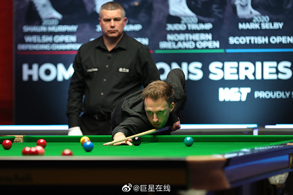 第一局,特鲁姆普长台不进,赵剑波单杆32分;特鲁姆普打带防不进,赵静波单杆22分;特鲁姆普打进一颗红球,黑球失误;赵剑波单杆42分拿下第一局。第二局,赵剑波打进一颗红球,绿球不进;特鲁姆普单杆117分拿下第二局。双方1-1。