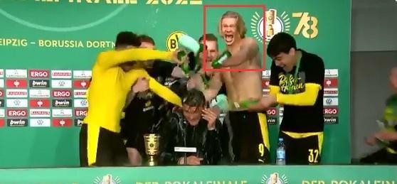 赛后主帅泰尔齐奇在新闻发布会也没能逃过多特众将的啤酒“袭击”,上身赤裸的哈兰德表情狰狞。