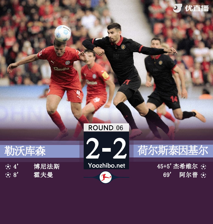 24直播网讯 北京时间10月5日21:30,德甲第6轮,勒沃库森主场对阵荷尔斯泰因基尔。上半场,博尼法斯破门为勒沃库森先拔头筹,霍夫曼进球扩大比分优势,半场结束前,博尼法斯又打进一球,可惜越位在先被吹,补时最后时刻,杰希维尔破门扳回一球!半场战罢,勒沃库森暂2-1荷尔斯泰因基尔;下半场,弗林蓬送点,阿尔普点射破门扳平比分!全场比赛结束,勒沃库森暂2-2荷尔斯泰因基尔!