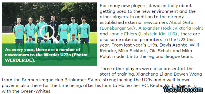 不莱梅U23梯队本周一下午开始了2022-23赛季的首堂训练课,来自不莱梅州联赛的布林库姆体育的李贤成和王博文加入了球队,他们将增强不莱梅U23梯队的实力。