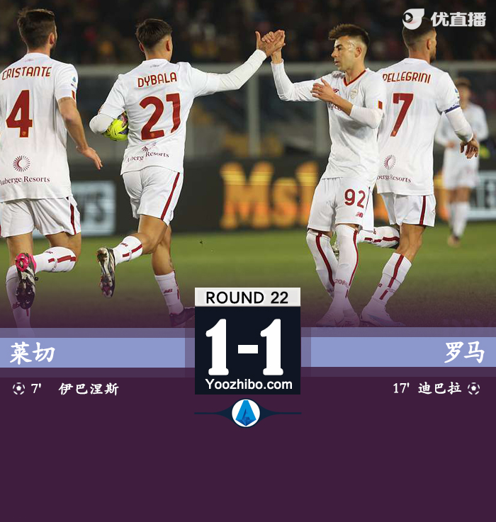 24直播网讯 北京时间2月12日凌晨1:00,意甲第22轮,罗马客场挑战莱切,上半场,伊巴涅斯自摆乌龙,斯莫林造点,迪巴拉点射破门扳平比分!下半场,双方均未能把握住进球机会。全场比赛结束,罗马1-1莱切!
