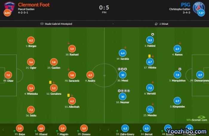巴黎首发:多纳鲁马6.9、金彭贝6.9、马尔基尼奥斯7.8、拉莫斯6.9、门德斯7.1、维拉蒂7.2、维蒂尼亚6.7、阿什拉夫8.3、萨拉维亚6.4、梅西10、内马尔10
