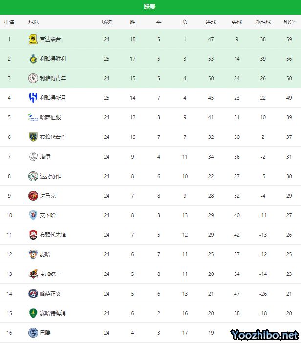 吉达联合排名第一,他们最近的表现稳定而出色,尤其是在2-1绝杀利雅得青年之后,这支传统豪门距离冠军越来越近了。目前吉达联合24轮59分,少赛一场的情况下领先第二名利雅得胜利3分,联想到吉达联合仅剩下6场联赛,所以他们夺冠的可能性是最大的。