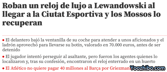 据悉,参与偷窃的一共有三位小偷,他们将赃物埋在一棵树下,以便日后取回。可惜有关部门还是办事效率极高,成功为莱万找回价值不菲的手表。