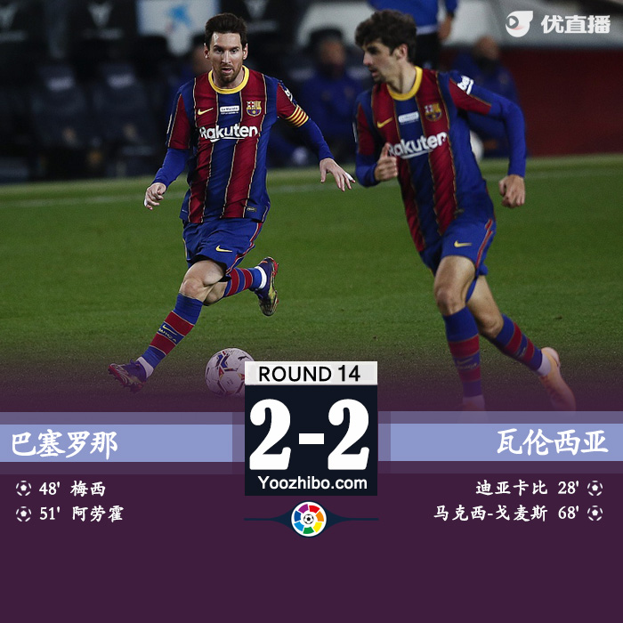 24直播网讯讯:北京时间12月19日23:15,西甲第14轮继续进行,巴塞罗那坐镇主场迎战瓦伦西亚。上半场,迪亚卡比抓住巴萨盯人失误头槌首开记录,半场结束前,格列兹曼造点,梅西操刀被扑后头球建功,打入巴萨生涯的第643个入球,就此追平贝利单一俱乐部进球纪录!下半场,阿劳霍凌空侧勾打入巴萨生涯处子球,马克西-戈麦斯捅射扳平比分。最终,巴萨主场2-2战平瓦伦西亚。