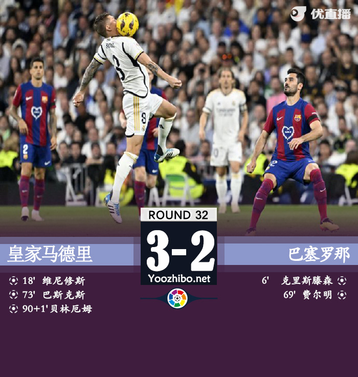 来源:24直播网04-22 06:29 24直播网讯讯:北京时间4月22日,西班牙足球甲级联赛迎来了第32轮的激烈对决,皇家马德里在主场迎战巴塞罗那。上半场,拉菲尼亚角球助攻克里斯滕森头球破门,亚马尔加速过人后打门被扑,库巴西绊倒巴斯克斯送点后维尼修斯点射扳平,亚马尔巧射被挡后皮球未能越过门线,德容与巴尔韦德对脚后伤退;下半场,亚马尔传中被扑后费尔明补射得手,维尼修斯助攻巴斯克斯凌空打门入网,维尼修斯快速前插打门被封堵,补时阶段贝林厄姆推射破门上演绝杀。最终,皇家马德里以3-2险胜巴塞罗那。