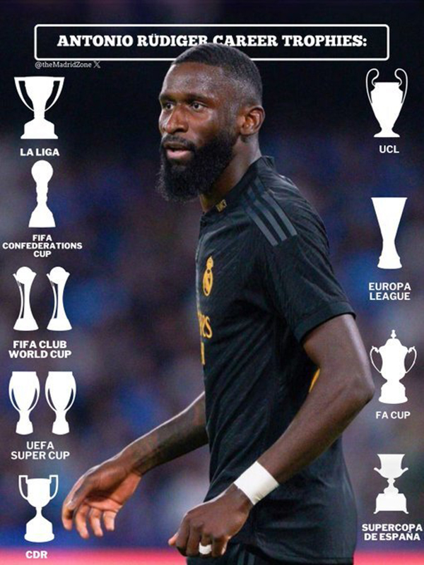 吕迪格和琼阿梅尼则等待了2个赛季。尤其是吕迪格,这是他生涯第11个冠军,也是他首次夺得联赛冠军,目前吕迪格的荣誉簿上,已经有1个欧冠冠军、1个西甲冠军、2个世俱杯冠军、2个欧洲超级杯冠军、1个欧联杯冠军、1个足总杯冠军、1个国王杯冠军、1个西班牙超级杯冠军和联合会杯冠军,妥妥的又一个“人生赢家”。
