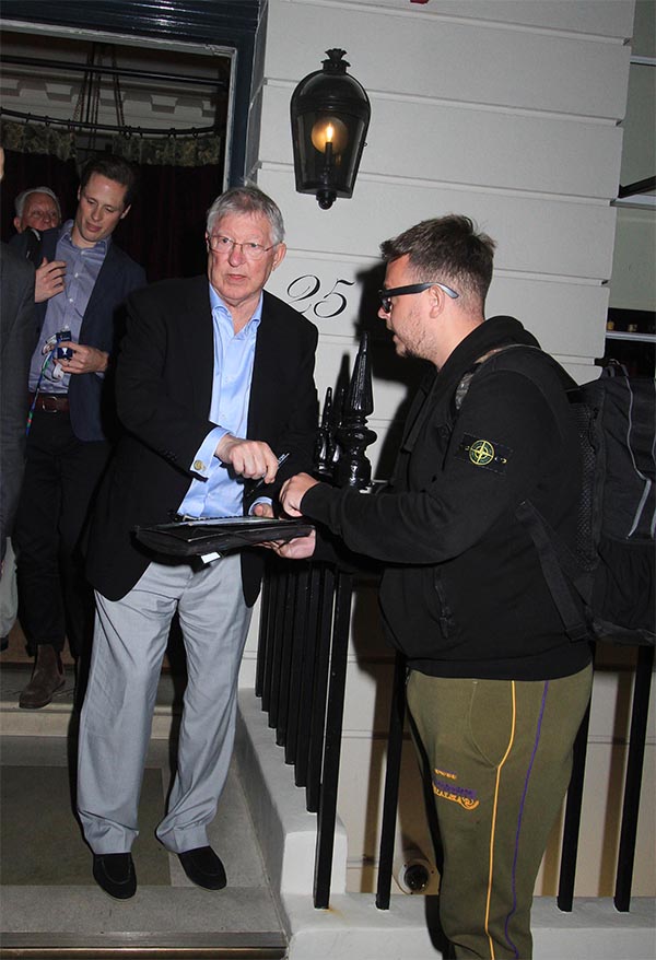 在皇马与多特的欧冠比赛前,弗爵也出现在伦敦。他被拍摄到在周五晚离开梅费尔区的奥斯瓦尔德俱乐部,与老爵爷在一起的还有水晶宫体育总监道吉·弗里德曼。现场的曼联球迷没有错过机会,拿出本子让弗爵签名。