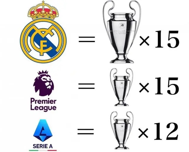 24直播网讯讯 皇马和五大联赛欧冠数对比:皇马15座与英超相同。