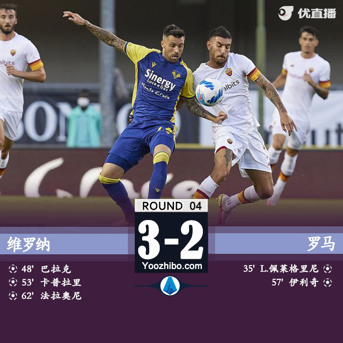 24直播网9月20日讯 北京时间9月20日凌晨0点整,2021-22赛季意甲4轮在本特戈蒂球场展开角逐,罗马客场挑战维罗纳。上半场克里斯坦特头球中框,佩莱格里尼蝎子摆尾破门,下半场巴拉克和卡普拉里先后进球,佩莱格里尼造乌龙,法拉奥尼世界波。最终罗马客场2-3不敌维罗纳,罗马遭遇赛季首败,开局六连胜被终结。